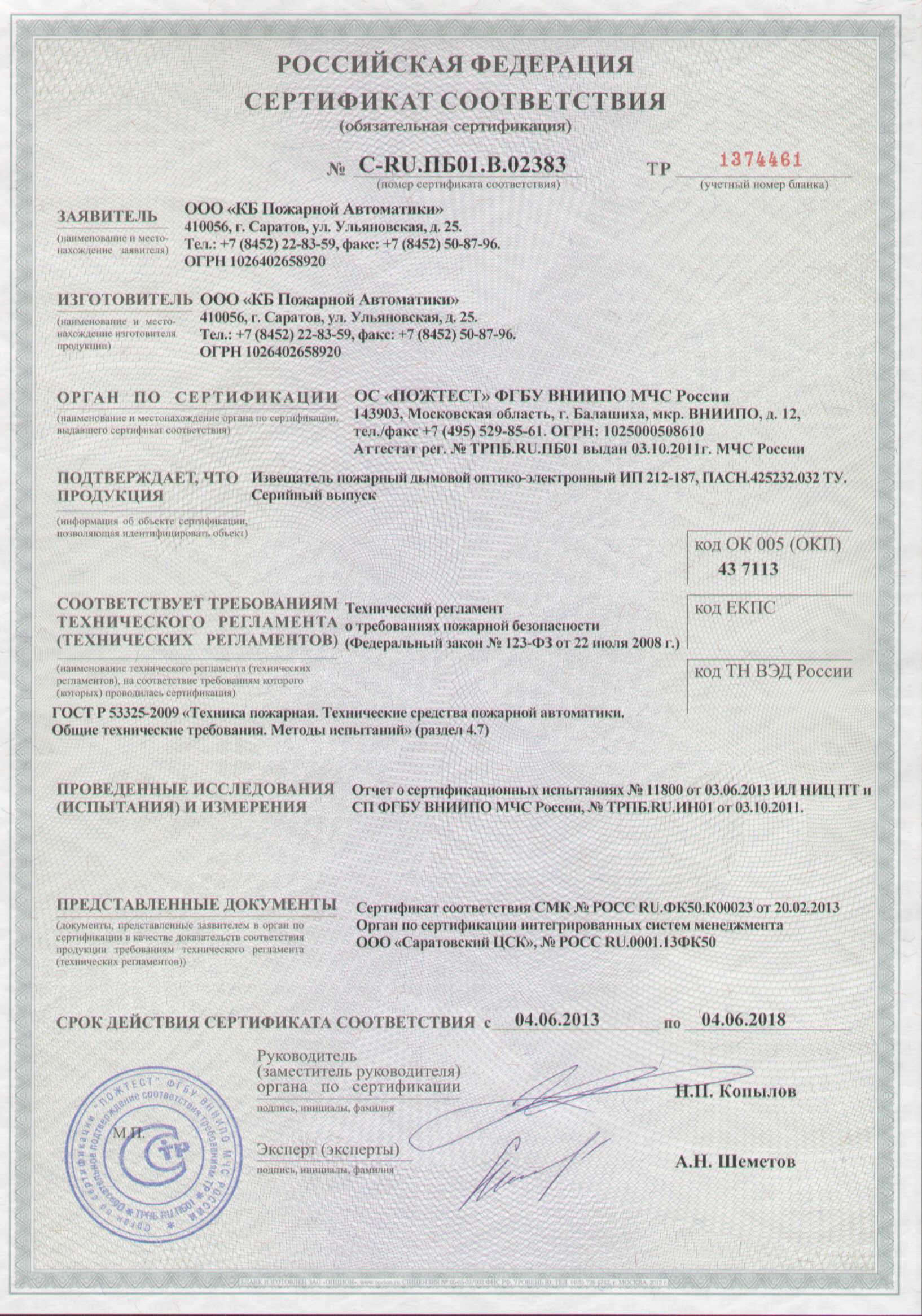 Извещатель пожарный дымовой оптико-электронный ИП 212-187 предназначен для раннего обнаружения загорания, сопровождающегося появлением дыма малой концентрации в закрытых помещениях различных зданий и сооружений. Питание извещателя и передача сигнала «Пожар» осуществляется по двухпроводному шлейфу сигнализации и сопровождается включением оптического индикатора при срабатывании извещателя. Извещатель не реагирует на изменение температуры, влажности, на наличие пламени, естественного или искусственного света.