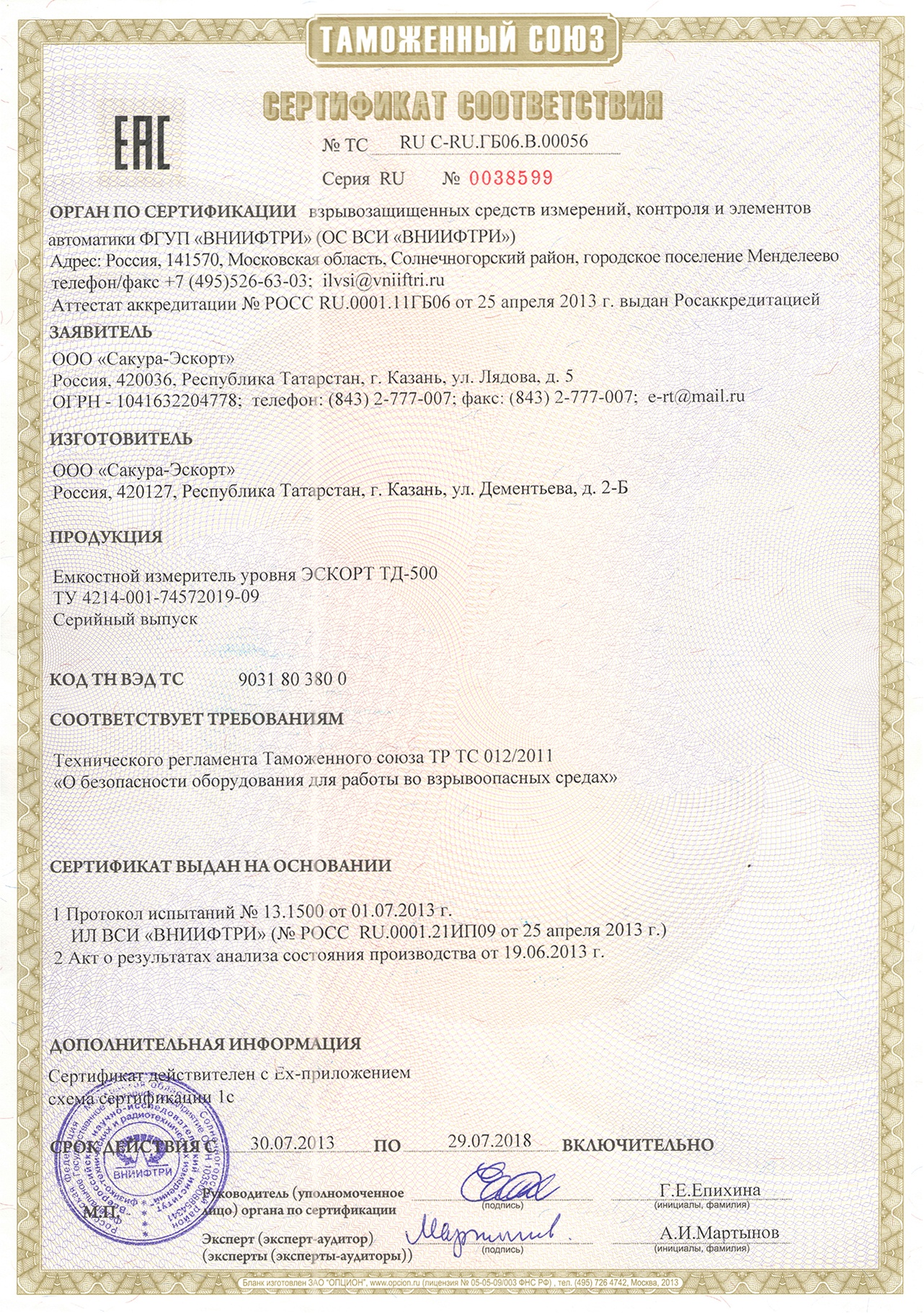 - имеет сертификаты взрывобезопасности и метрологии.