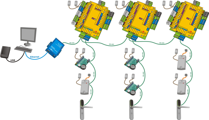 Инструкция, а также минимальное объединение проводником на клеммах обеспечивают простоту в установке и обслуживании. Благодаря наличию трех исполнительных элементов - два реле и полевой транзистор - контроллер идеально подойдет для управления электромагнитными и электромеханическими замками, турникетами и шлагбаумами. Также в отдельных конфигурациях обеспечивается подключение активатора, требующего подачи напряжения разной полярности для открывания и закрывания. Наличие отдельного входа для пожарного шлейфа повышает пожарную безопасность, так как перевод его в активное состояние обеспечивает разблокировку прохода вне зависимости от наличия связи с компьютером. Наличие второго порта RS-485 реализовано в рамках контроллера, как гальванически развязанный повторитель линии RS-485. Таким образом, длинная сеть может построена, как несколько коротких гальванически развязанных участков. Это значительно повышает помехозащищенность. При этом программой все устройства воспринимаются подключенными к одной линии RS-485.